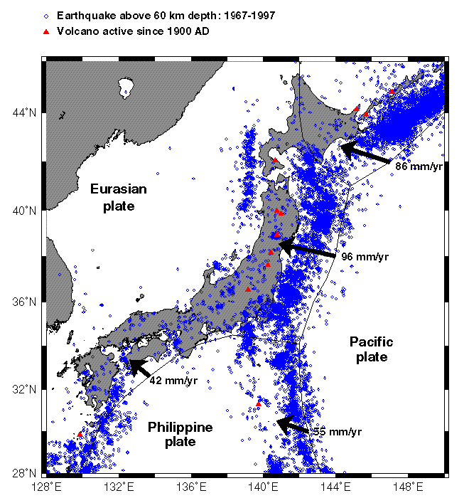 Shallow earthquakes in the vicinity of Japan. All earthquakes shallower