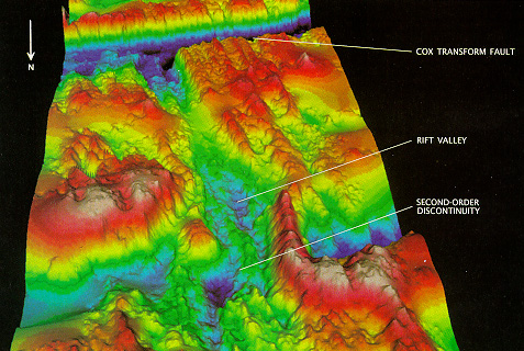 discontinuity called the Cox transform fault. Colors indicated depths of