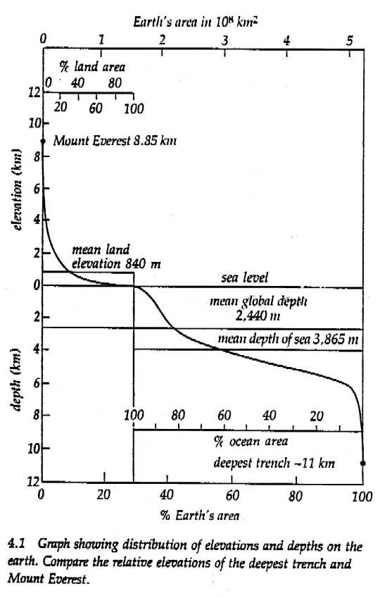 The remarkable bimodal distribution (a distribution with two peaks) of surface heights cannot be ignored when attempting to understand the geology of Earth's surface. Ultimately, this bimodal distribution relates to the theory of plate tectonics, which will be the subject of the next lecture.