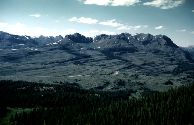 058-18: Molas Pass area, San Juan Mtns, CO. Treeless area below peaks was caused by the Lime Creek Burn of 1879. Layered sedimentary rocks produce the tabular structure. (29Jun60)