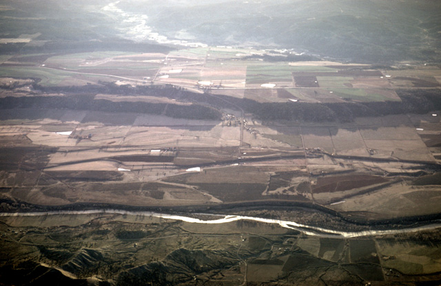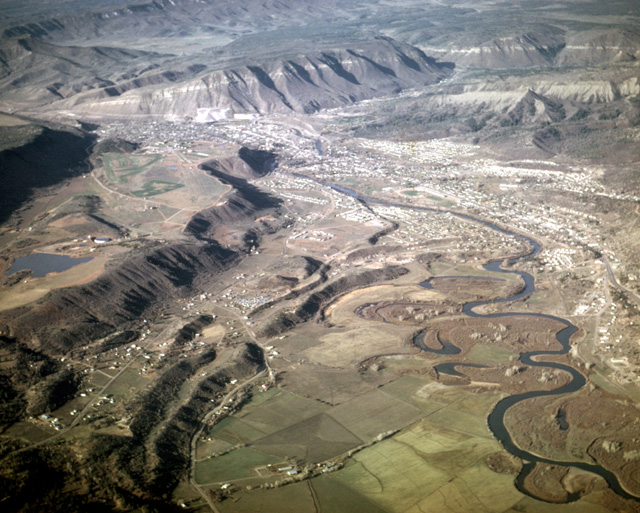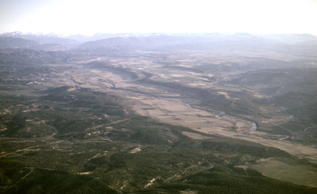 114-11: Animas River Valley and Florida Mesa, 20 miles south of Durango, CO. View to NNE. The Florida River joins the San Juan just off the photo at the right. Note the terraces (edges in shadow) on the edge of the Mesa; these can be traced to glacial moraines in Durango. See also photo 114-15. (12Apr66)