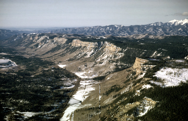 114-34: Hermosa Cliffs (Hermosa fm, Pennsylvanian) in San Juan Mtns, 20 miles north of Durango, CO. View to south, Hy 550 and Durango narrow gauge RR in view. Note beveled spurs; this valley contained about 2000 feet of glacial ice that nearly reached the top of the cliffs several times during the Pleistocene. (12Apr66)