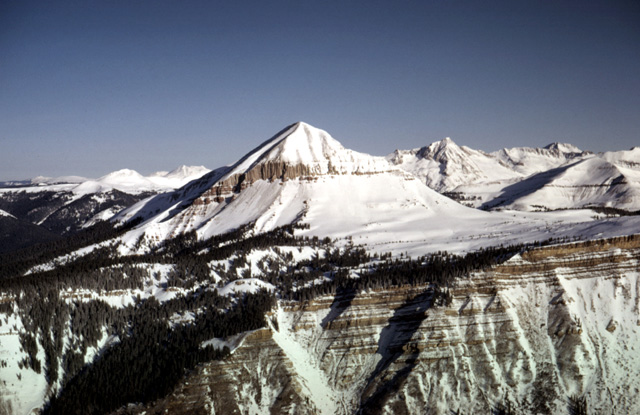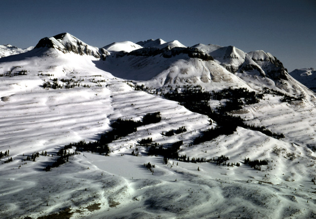 115-25: Molas Pass area, San Juan Mts, CO. Layers under snow are Carboniferous sediments. The overlying rocks at the mountain crests are crystalline rocks of Tertiary age. View to the north. Area burned over by Lime Creek Burn in 1879. The fire moved from southwest to northeast, leaving unburned forest remnants on the down-wind sides of firebreaks like that of Little Molas Lake which lies under the snow in the foreground. (12Apr66)