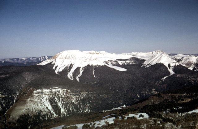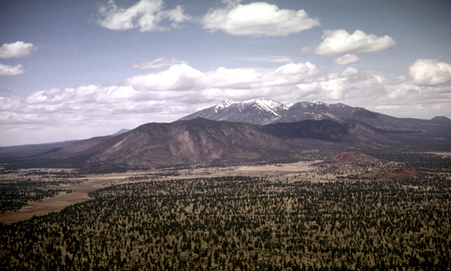 118-07: San Francisco Mountains, north of Flagstaff, AZ. Humphreys Peak (12,635 ft) is covered with snow. View to the northwest. (12Apr66)