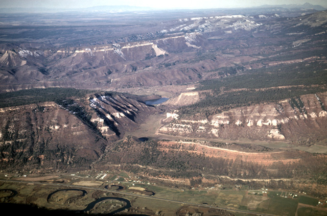 115-29: Looking WSW at the north side of Animas City Mtn, just north of Durango, CO. Mesozoic rocks are exposed in the canyon wall. Part of the meander belt of the Animas River is in the foreground. During the Pleistocene, this valley was filled with glacial ice. When the glacier reached this locality, Animas City Mtn deflected some of the flow to the west. Notice the basin of Chapman Lake that is formed by the small terminal moraine at its west side. Sleeping Ute Mtn is on the horizon at the right; the Carizo Mtns are at the left. (12Apr66)