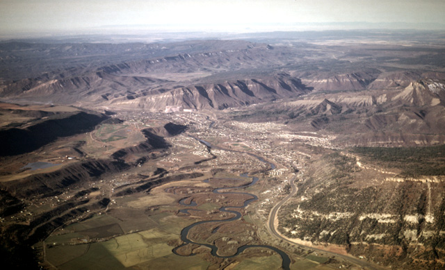 114-15: Animas River terraces south of Durango, CO. View to the east. In the foreground the San Juan River flows to the right; the Florida River (east of the Mesa) joins the San Juan several miles downstream. Terrace levels represent aggregating streams during glacial periods; they can be traced to moraines in Durango. (12Apr66)