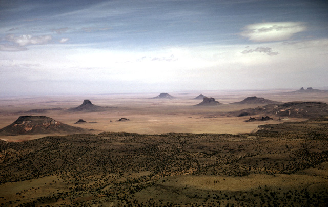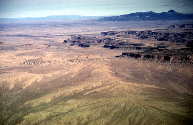 116-09: Outlying mesas south of Mesa Verde, CO. View to northwest. Sleeping Ute Mtn at right middle distance; Abajo Mtns (UT) in background. (12Apr66)