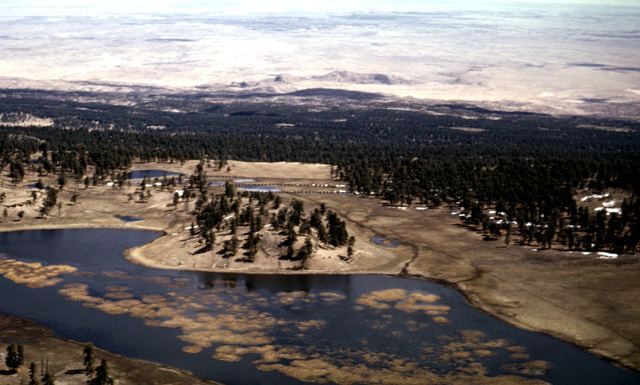 117-01: Whiskey Lake, Chuska Mtns, NM. View to the ENE. The Chuska sandstone (Tertiary) represents a dune field that once occupied a valley. A siliceous cement has made the Chuska sandstone more resistant than its surroundings, and a reversal of topography has taken place. A series of partially-connected lake basins occur on the broad crest of the Chuskas. Their origin is not certain; it is thought that selective removal of cement by groundwater action may have caused localized subsidence. In the photo a series of NW/SE-aligned fresh landslide blocks can be seen east of the Chuska escarpment. These appear to occur at places where the sandstone is underlain by clay of Mesozoic age. Very highly weathered ancient landslide debris extends 10 miles to the east into the San Juan basin. (12Apr66)
