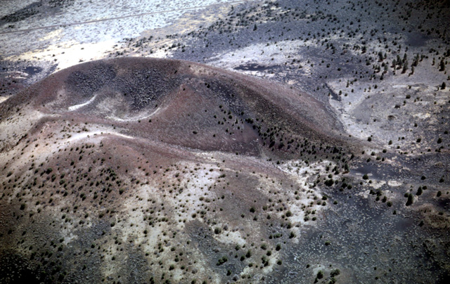 118-19: Cinder cones on north flank of San Francisco Mountains, north of Flagstaff, AZ. View to the northeast. Pine trees provide scale. (12Apr66)