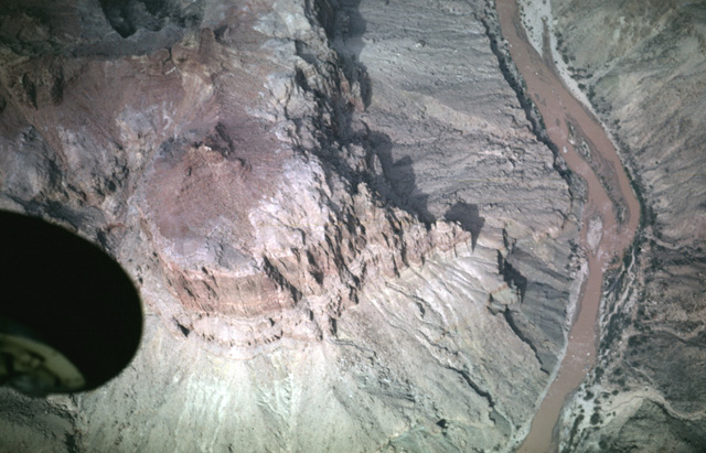 119-23: Looking down 4000 ft at Little Colorado River near its junction with the Colorado River in AZ. Plane wheel at lower left. (12Apr66)