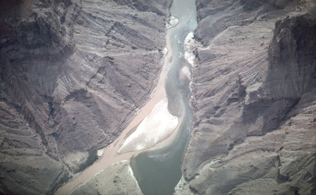 119-25: Confluence of Colorado River and Little Colorado River in the Grand Canyon, AZ. View downstream to the southwest. Note the red color of the Little Colorado River; the Colorado has left its red mud behind the Glen Canyon Dam 60 miles upstream. (12Apr66)