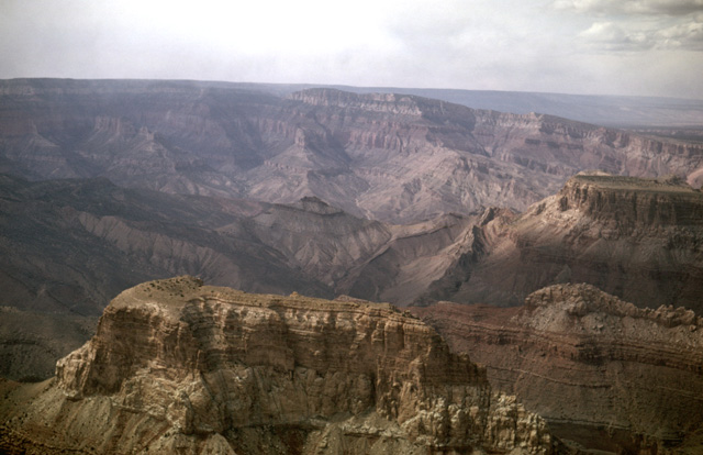 119-28: Grand Canyon, AZ. View northwest. Kwagunt Butte in foreground is capped by Permian Kaibab fm; lower butte to the right is Malgosa Crest, which is capped by a remnant of Permian Coconino ss. Nankoweap Mesa is in the middle distance at the right margin. Note the vertical beds to its left; these are drag folds along a faulted part of the East Kaibab Monocline. See also photo 119-34. (12Apr66)