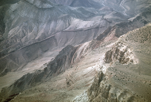 120-12: Hanging valleys along Colorado River in Marble Canyon, about 20 miles downstream from Page, AZ. View to southeast. Echo Cliffs are in the background. (12Apr66)