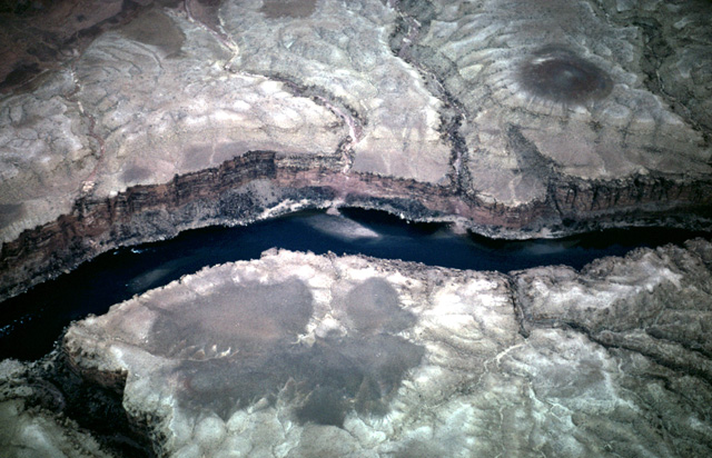 118-26: Eroded lava flow and Little Colorado River about 15 miles south of Cameron, AZ. View to north. See also photo 118-30. (12Apr66)