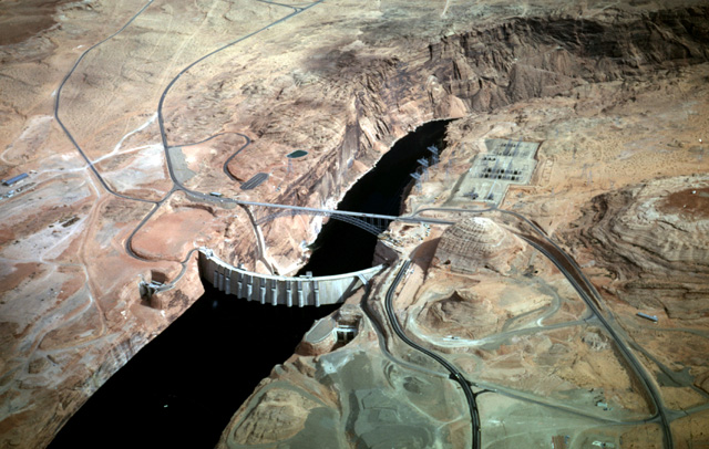 120-18: Colorado River and Glen Canyon Dam at Page, AZ. View downstream. Rocks are part of the Glen Canyon group of Triassic and Jurassic age. (12Apr66)