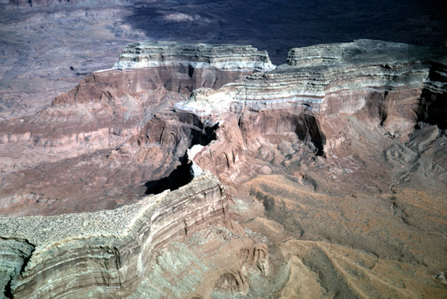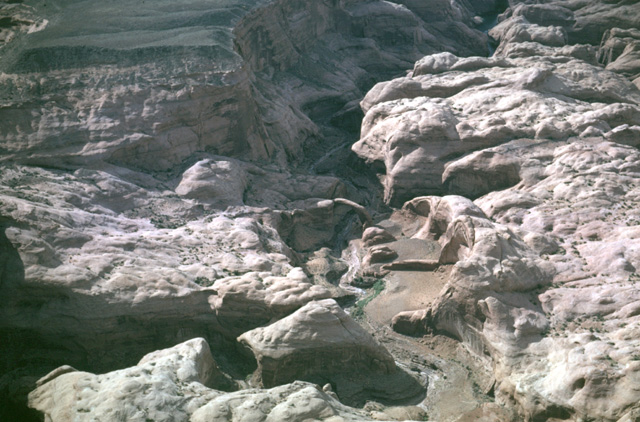 120-26: Horizontal strata (Mesozoic) and a narrow divide between buttes near Page, AZ (12Apr66)