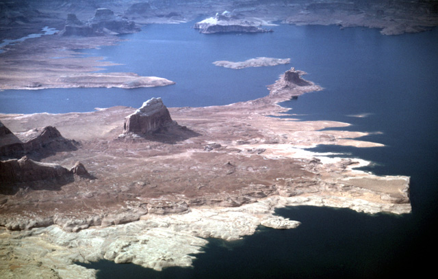 120-27: Powell Reservoir and buttes of Glen Canyon group (Triassic-Jurassic) at AZ/UT state line. View westward. (12Apr66)