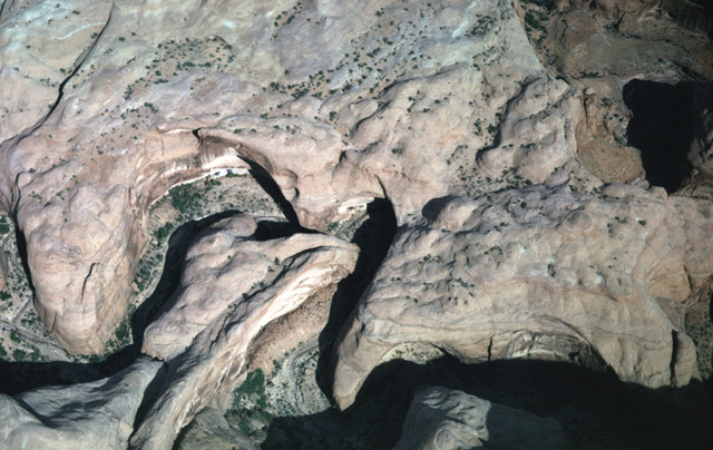 120-36: Potential new "Rainbow Bridges" in Forbidden Canyon to north of Rainbow bridge, UT. Rock is Navajo ss (Triassic-Jurassic). (12Apr66)