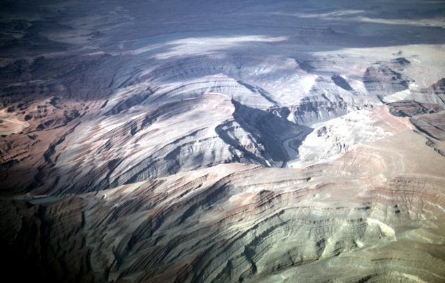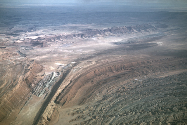 122-09: East limb of anticline along San Juan River east of Mexican Hat, UT. View southeast. Rock ages range from Pennsylvanian to Jurassic. (12Apr66)