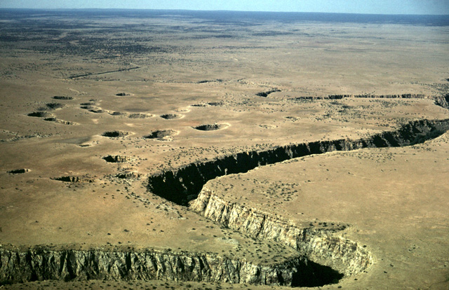 147-23: Aligned sinkholes in Permian Kaibab ls along right bank of Chevelon Fork (of the Little Colorado River), 18 miles southeast of Winslow, AZ. View to the northwest. For scale, there is a white-faced cow at about the "eight o'clock" position to the left of a small tree at the edge of the second sink from the lower border of the photo. (13Jun66)