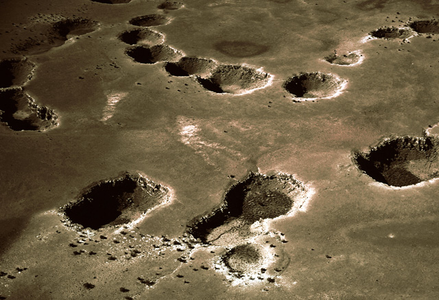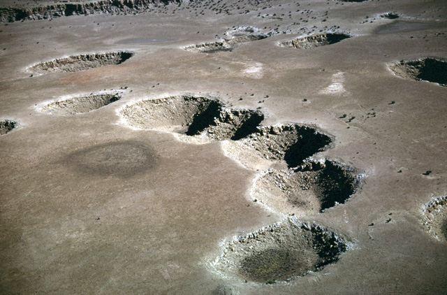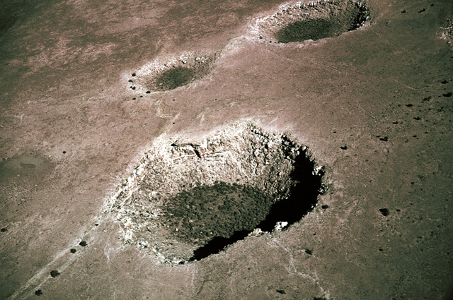 147-22: Three sinkholes aligned along a fracture. Sinkholes in Permian Kaibab ls along right bank of Chevelon Fork (of the Little Colorado River), 18 miles southeast of Winslow, AZ. View to the north. Small juniper trees provide scale. (13Jun66)