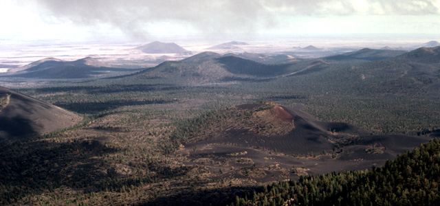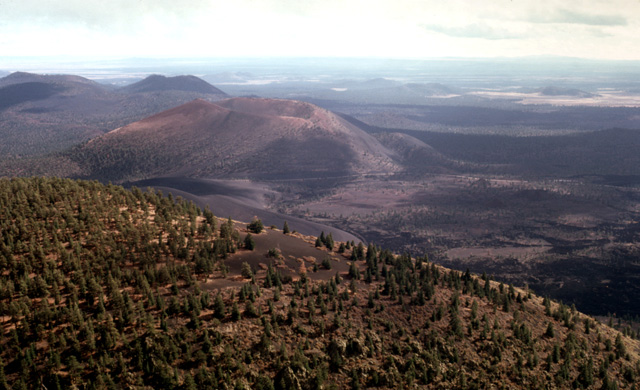 334-18: Sunset Crater (erupted in 1190 A.D.) northeast of the San Francisco Mountains north of Flagstaff, AZ. View to the southeast. Note remnants of volcanic ash among the trees in foreground. (25Oct87)