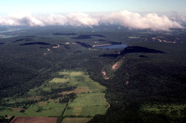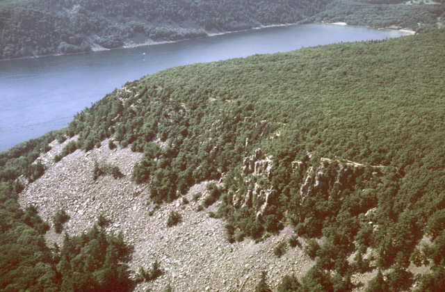 152-21: Devils Lake cliffs at Devils Lake State Park, 3 miles south of Baraboo, WI. View is to the northwest. The Precambrian quartzite, on the south limb of the Baraboo Syncline, dips to the north. The quartzite valley in which Devils Lake is located was blocked by glacial moraines during the Quaternary; the northern blockage can be seen at the upper right. (3Aug66)