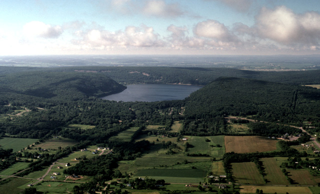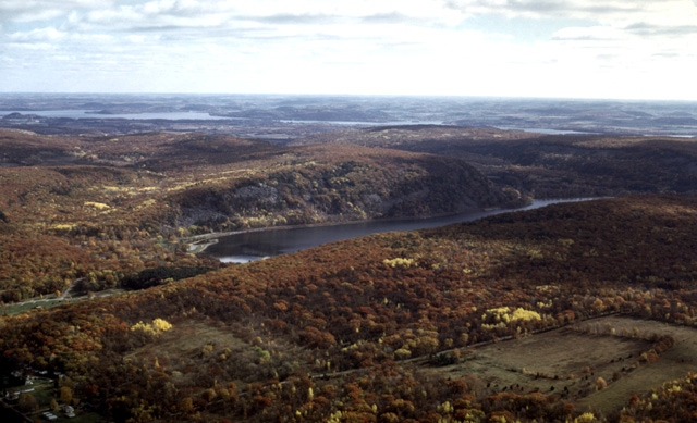 431-14: Devils Lake gorge, 7 miles southeast of Baraboo, WI. View looking west. The tree-covered mass that blocks the valley just this side of the lake is the end moraine of the Green Bay lobe. The moraine can be traced over the uplands on both sides of the gorge. Devils Nose is on the left; the line along its base is the route by which the Chicago and Northwestern Railroad crosses the South Range of the Baraboo Syncline. (30Jun98)