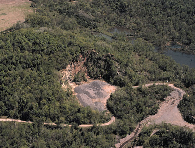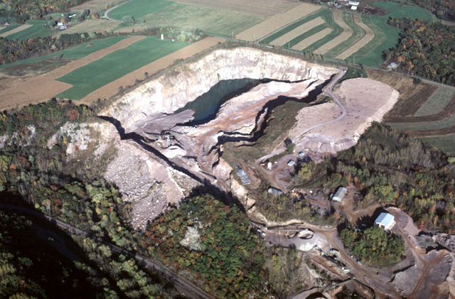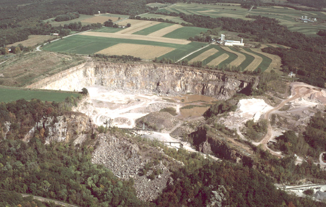 434-10: La Rue Quarry, 1 mile south of La Rue, WI. View to the southeast. The quarry is in the Baraboo Quartzite (Precambrian) on the south limb of the Baraboo Syncline. Note piles of broken quartzite that are awaiting shipment. (9May99)