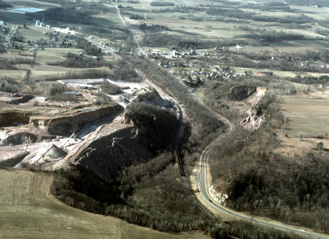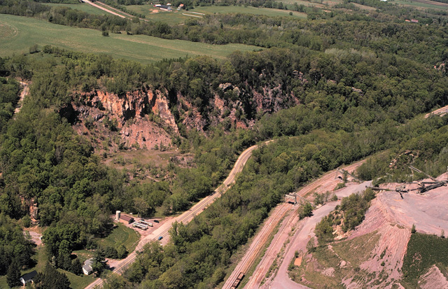 438-09: Pink Lady Quarry north of Rock Springs, WI. Vertical Baraboo quartzite is being quarried here for railroad ballast. View to the northeast. Note the jagged valley wall of Ableman Gorge in the foreground. Quarrying operations had created a dividing rock wall that was, by State Law, too narrow for its height; the top of the divide was lowered. (30Aug99)