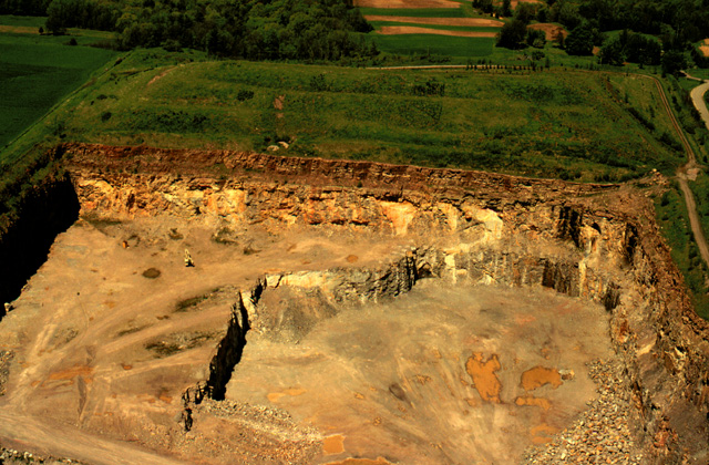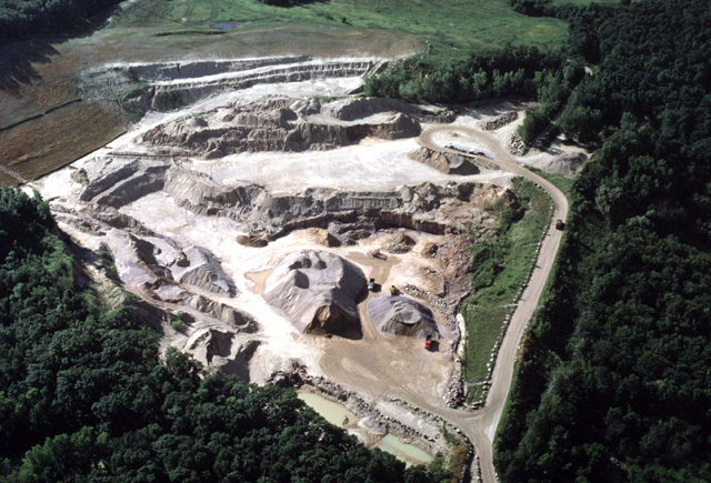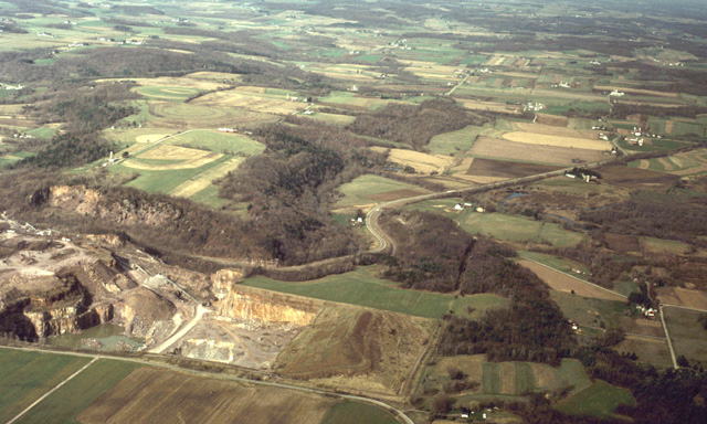 444-24: Quarry in the Johnstown Moraine along Tower Road at the crest of the South Range of the Baraboo syncline 5 miles SE of Baraboo, WI. View to SW. Quarrying began in outwash sediments west of the moraine. A few years ago the underlying Baraboo quartzite was encountered (center of view), and it is being utilized as well. (11Jul01).