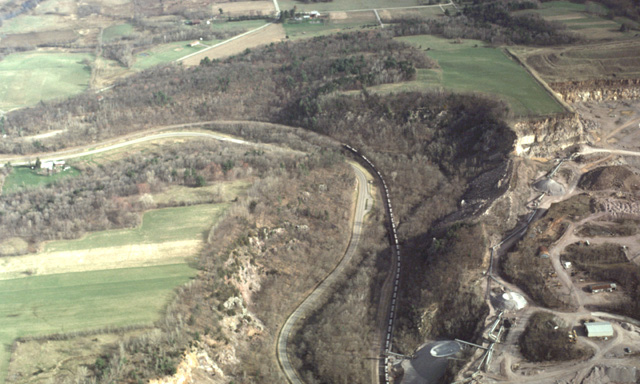 430-26: Ableman Gorge north of Rock Springs, WI. This is the Upper Narrows of the Baraboo syncline. View is to the north. The train is loading broken quartzite from the Pink Lady quarry. (10Apr98)