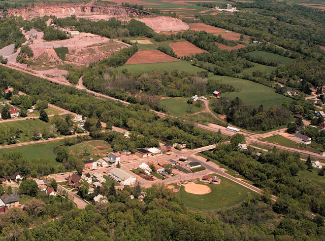 434-11: Rock Springs, WI at the southern end of Ableman Gorge on the north limb of the Baraboo Syncline. The Pink Lady quarry at the upper left of the photo produces quartzite that is used for ballast between railroad ties. The Chicago and Northwestern Railroad parallels the Baraboo River that cuts diagonally across the photo. (9May99)