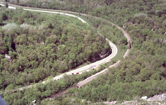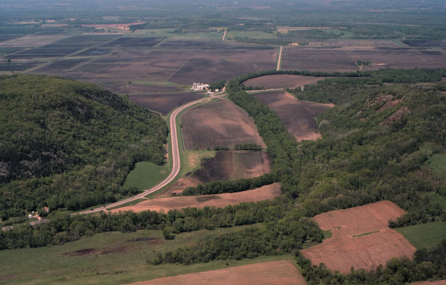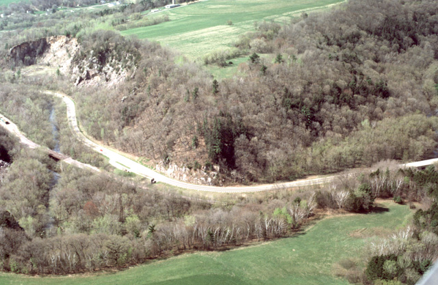 371-21: Ableman Gorge north of Rock Springs, WI. View to the south. The Pink Lady Quarry is at the left. Van Hise Rock is near the bend of the highway in the foreground. The site is on the north limb of the Baraboo Syncline. The Precambrian Baraboo quartzite strikes east/west and is vertical. The upland is composed of horizontal Cambrian sandstone. (6Apr90)