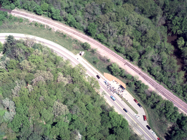 434-15: Van Hise Rock National Historic Landmark Dedication in Ableman Gorge (Upper Narrows) north of Rock Springs, WI. View to the northeast. Van Hise Rock is to the right of the gathering where the highway and the railroad are closest. See also photo 434-13. (9May99)