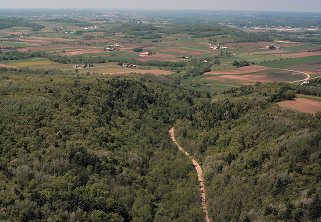 434-18: Gorge of Upper Narrows Creek of the Baraboo Syncline 2 miles west of Rock Springs, WI. View to the northwest; Reedsburg, WI is in the distance at the right. Remnants of the Upper Cambrian sandstone that once filled this valley can still be found; hence the original valley cut in the Baraboo quartzite predates that time. (9May99)