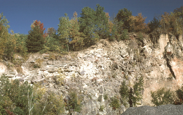 434-17: Pink Lady Quarry north of Rock Springs, WI. View to the north. The east/west-trending Baraboo Quartzite (Precambrian) of the north limb of the Baraboo Syncline is vertical at this location, and the strike is almost parallel to the north quarry wall. The quartzite is unconformably overlain by marine sandstone of Upper Cambrian age; it is the darker brown unit under the green vegetation. When the Cambrian seas reached this area, the quartzite formed a linear ridge that was progressively submerged while also being eroded by the waves; rounded pebbles and cobbles form coarse facies in the Cambrian sandstone formation. Today the quartzite is broken up for use as ballast between railroad ties. (9May99)