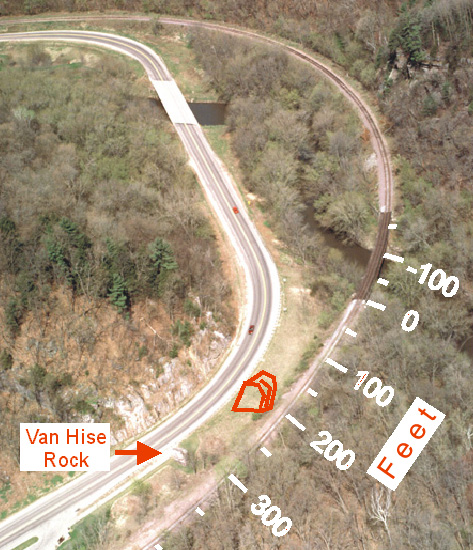 443-10: Ableman Gorge to the north of Rock Springs, WI. View to the north. The arrow points to Van Hise Rock; the red schematic structure indicates the quartzite outcrop shown on Ablemanv.jpg. Distance is measured from the south foundation stonework of the railroad bridge over the Baraboo River and the scale is corrected for perspective. (28Apr01)