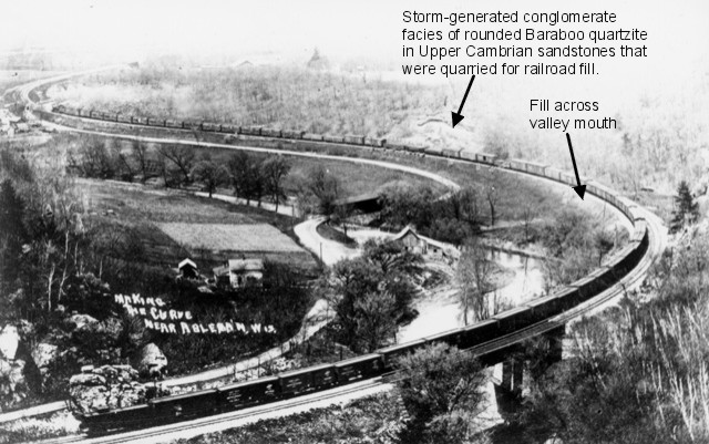 Ablemanv.jpg: "Making the Curve near Ableman, Wis." is an interesting picture postcard that was taken in the Upper Narrows in the early 1900's. Ableman was the former name of Rock Springs, WI. The picture is from the collection of Fred Galley of Portage, WI, who graciously granted me permission to use it. The photo fits with a collection of air photos because its original camera position is now a number of feet in the air owing to the lowering of the valley wall between the gorge and the adjacent Pink Lady Quarry (see comments with photo 438-09). The photo is undated, but it was probably taken during the first decade of the 20th Century. The second track was completed just after 1900, and the quarries that provided roadway fill--and the fill itself--are fresh and clearly shown on the photo. (The conglomerate was transported off-shore when Cambrian seas beat against the exposed quartzite cliffs.) The covered bridge, by which the road crosses the Baraboo River, was replaced in 1923 (Reedsburg Times, July 13, 1923). The large quartzite outcrop between the caboose and the highway (lower left corner) immediately caught my attention. Does it include Van Hise Rock? The railroad reverted to a single track in 1954, but the bridge foundation was not altered. In August 2000 I used a tape to measure the 186-foot distance between the stone foundations of the railroad bridge. The distance from the south foundation to Van Hise Rock is 309 feet. There are about four and one-third box cars on the bridge (each car averages 43 ft), and there are five cars between the bridge and the south end of the outcrop by the caboose (215 feet). Van Hise Rock must lie off the left end of the photo. See photo 443-10vc for the reconstructed position of this quartzite mass that was almost 60 feet long and 35 feet tall. A plaque was affixed to Van Hise Rock in 1923; perhaps that was the only way to save it from the same fate as the block on this postcard. My thanks to Donna Lange, Robert Dott, and William Cronon for information used in this caption.