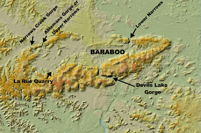 barabovc.jpg: Digital Terrain Model of the Baraboo Syncline showing the locations of some of the sites shown in the photos.