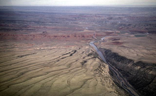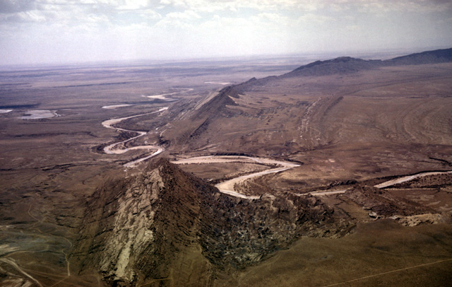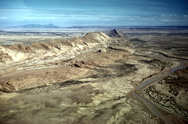 113-12: Chaco River cuts Hogback Mountain (a monocline) 20 miles west of Farmington, NM. View is to the south from over the San Juan River. The Chaco River is superimposed upon this ridge. (11Apr66)
