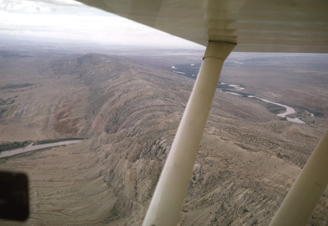 091-04: Sheep Mountain, Bighorn Basin, WY. The Bighorn River, flowing over Tertiary basin fill was superimposed upon the Sheep Mountain anticline. View toward the southeast looking upstream. Struts belong to a rented Piper Scout. See Lovell-Greybull Area, Big Horn Co., WY, Department of Agriculture, Commodity Stabilization Service, 1961: Air photo BBN-3BB-110. (27Jun65)