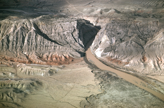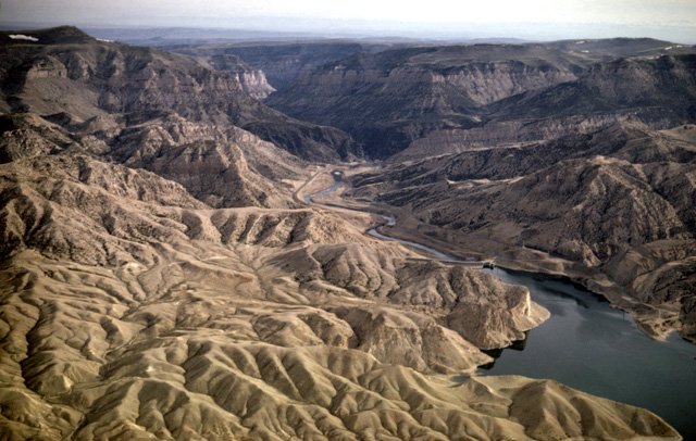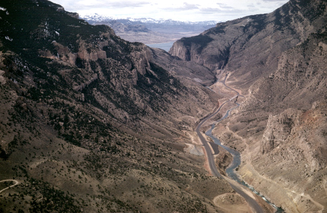 130-18: Boysen Reservoir, Wind River canyon through Owl Creek Mountains, 25 miles northeast of Riverton, WY. View to NNE. The Wind River changes it name to the Bighorn River as it passes through the Owl Creek Mountains; the stream is superimposed on the mountain structure. (15Apr66)