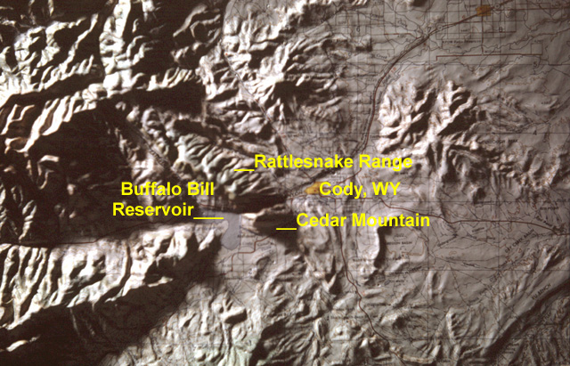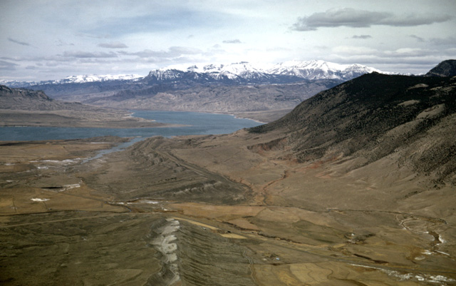 131-22: South side of Cedar Mountain, 6 miles southwest of Cody, WY. View to west showing Buffalo Bill Reservoir on the Shoshone River and the Absaroka Range east of Yellowstone Park. That the Shoshone River has cut a valley between Cedar Mountain and Rattlesnake Mountain rather than draining south of Cedar Mountain is taken as evidence that the stream was superimposed across this once-buried ridge. Compare this view with photo 131-31. (15Apr66)
