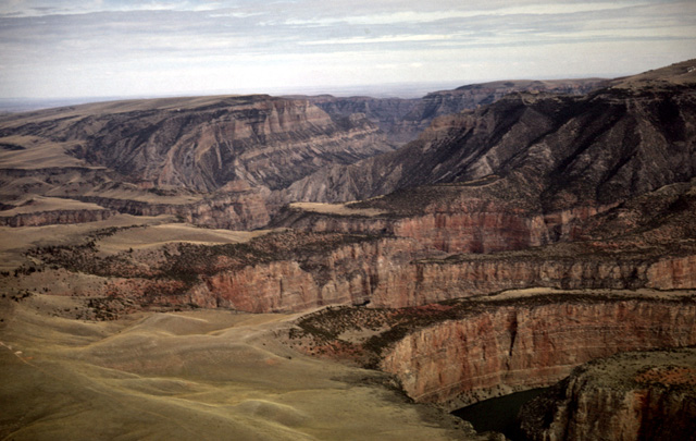132-20: Bighorn River canyon between the Pryor and Bighorn Mountains in MT. View to the northeast. This is another superimposed stream. (15Apr66)