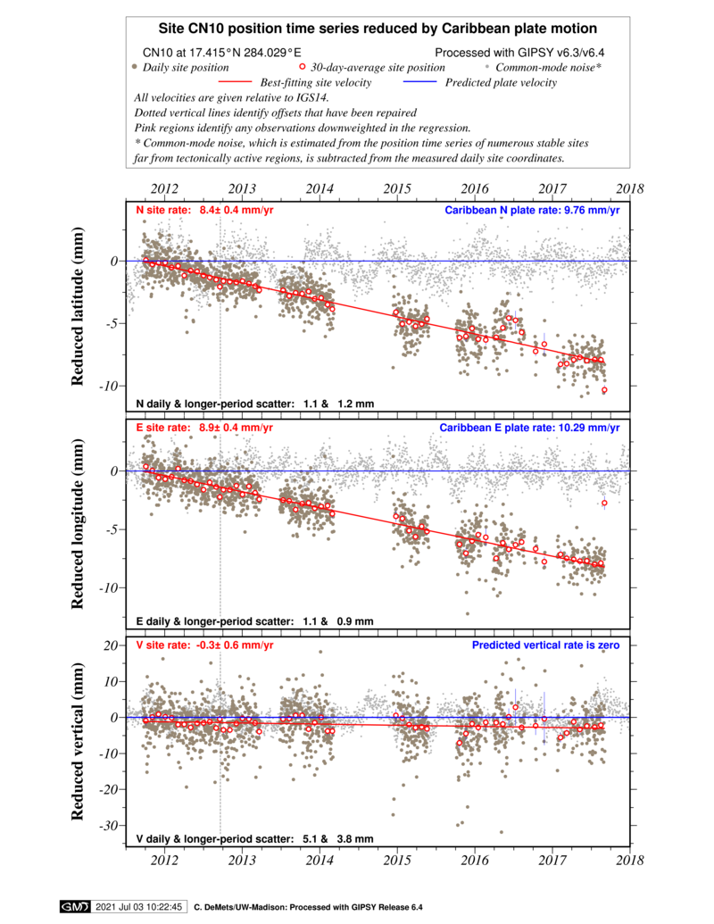 Table information: The table beneath the map provides clickable links to the coordinate time series for all the continuous GPS stations in Jamaica. Each graphic shows the sequence of daily station latitudes, longitudes, and elevations estimated from processing of daily GPS data at UW-Madison (information about the processing is given on the home page of this web site). Red circles in the graphics show the 24-hour coordinate estimate; blue circles show averages determined from 30 days of daily estimates. Station motions are relative to the Caribbean plate interior and thus vary about the horizontal line (representing zero motion). Each graphic gives both the best estimate of Caribbean plate motion at the site location and the best-fitting slopes for the site coordinate time series. "WN" indicates the amount of daily scatter in millimeters of the site coordinates about the mean location.