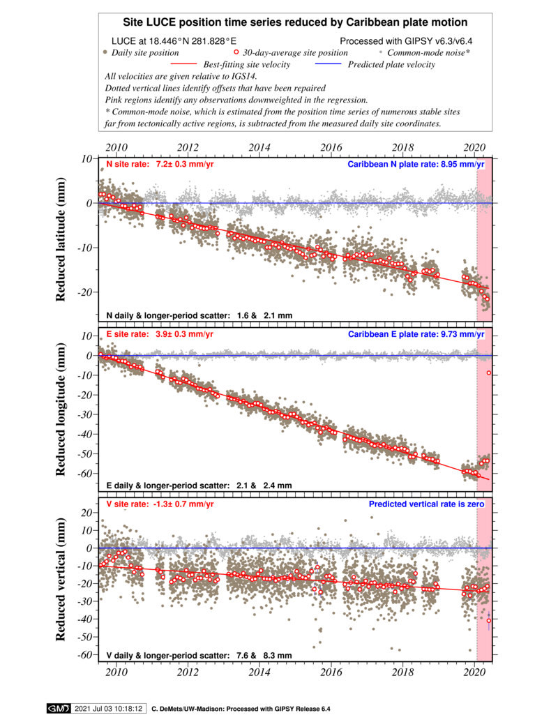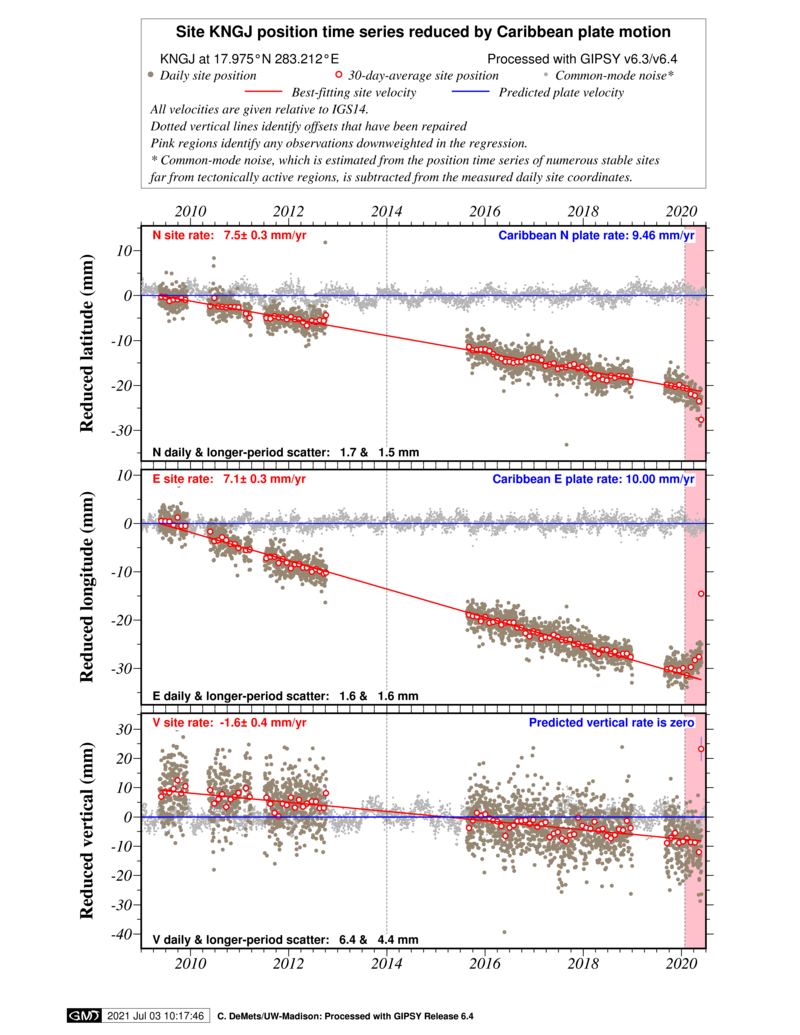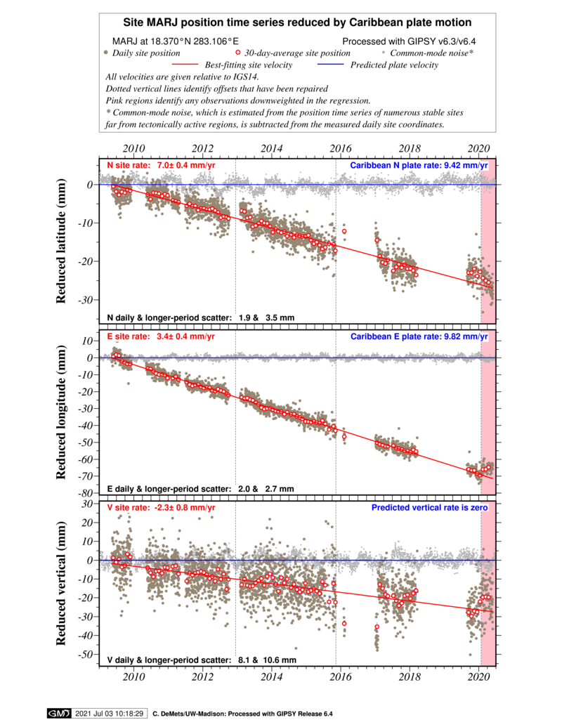 Map information: The map at the right shows the motions of the National Land Agency and other regional GPS stations with respect to the interior of the Caribbean tectonic plate. Red arrows are NLA sites; blue arrows are for other sites.