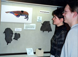 Fossil Vertebrates Graduate student Christopher Ott has been put in charge of the Fossil Preparation Lab. In April, Chris unveiled his expertly-crafted balsa wood model of the flying reptile, Pteranodon. The reconstruction was based on material that was collected in recent years from the Cretaceous-age Niobrara Chalk deposits of northwest Kansas. The Pteranodon, its wings spreading over 20 feet, now soars above the Mastodon and the Edmontosaurus dinosaur in the Museums vertebrate hall. Chris Ott and student aide Lisa Buckley led a two-week expedition exploring the badlands of eastern Montana for bones to supplement our Triceratops reconstruction project. The 5-foot-long skull is scheduled to be on exhibit by the end of the year 2000. A $3,000 grant from the Universitys Natural History Museums Council provided funds for the preparation, identification and cataloging of a significant part of our collection of fossil vertebrates. In the process, we identified the partial skull of a Leptoceratops dinosaur from the Cretaceous Hell Creek Formation of Montana, a genus that has never before been found in these deposits. Lisa Buckley has been busy identifying the Museums collection of theropod (meat eating) dinosaur teeth, ranging from those of gracile raptors to massive ones of Tyrannosaurus rex. Once the rock matrix had been removed from some of the poorly-preserved bones labelled Tyrannosaurus, it was discovered that they were actually the bones of a Triceratops. At this point, we are not sure as to the identity of the "Tyrannosaurus" bones that are still encased in plaster jackets awaiting cleaning and preparation. Teacher Training The Paleontology Field Experience and Curriculum Development program, funded by the Howard Hughes Medical Institute, the University of Wisconsin-Madisons Graduate Division, and the Department of Geology and Geophysics has successfully completed its second year. The program is overseen by Joe Skulan assisted by high school teachers, Marilyn Hanson and Steve Bower. Its centerpiece is a three-week intensive training program in June. The six teachers worked part of the time at the Museum and in various labs on campus, and went on a one-week expedition to Kansas and Wyoming recovering mosasaur bones and mapping dinosaur tracks. The results of the "Paleontological Experiences" have been presented at several national science teachers conventions. View the project websiste at http://www.geology.wisc.edu/~museum/hughes/. The Museum and the Web Meanwhile, the Museums project assistant Matt Kuchta catalogued some of the museums collections and entered the data into our computer. Matt is also in the process of updating the Museums web page with an improved text and many new pictures. The virtual Museum can be visited at www.geology.wisc.edu/~museum. Lectures, Public Programs As part of the Universitys On the Road program, Museum Director Klaus Westphal gave several slide presentations on the Museums dinosaur expeditions and displays. He also took part in the Universitys Sesquicentennial celebration with a dinosaur program at the Elvehjem Museum of Art. Other outreach included participation in a "Quarry Day", a day-long public event at Madisons Yahara Quarry, with an exhibit of fossils that can be found in Wisconsin. This year again, the Museum was one of the destinations for children enrolled in the Nature Passport Program. The free passports are a way to motivate younger children to explore educational nature programs and facilities in the area. During that time, enjoyed responding to the many questions raised by the inquisitive youngsters. The Museums Annual Open House featured the unveiling of the flying reptile Pteranodon, slide programs on Planet Mars, and the ever-popular Rock Pile for Kids. Many of the specimens for the Rock Pile were generously supplied by Burnies Rock Shop, Madison. Plan B Design Studio of Hazel Green, once again made dinosaur face masks with our youngest visitors. Exhibits This years Special October Exhibit, "Colorado Classics", featured a collection of colorful minerals from some of that states famous historic mines. The collection, on loan from the Denver Museum of Natural History, was brought to us by UW-Madison alumnus James Hurlbut. |