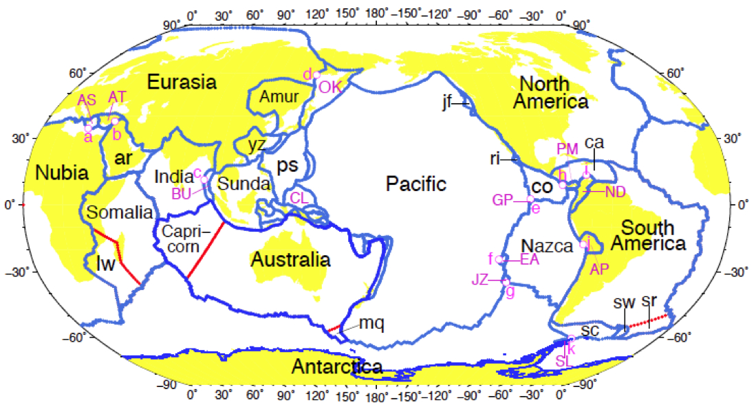 | AS: Aegean Sea | AM: Amur | AP: Altiplano | AT: Anatolia | AN: Antarctic | AR: Arabia | AU: Australia |